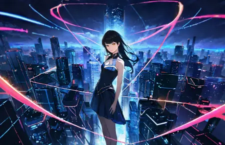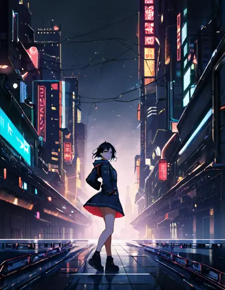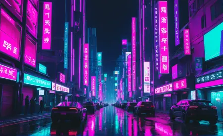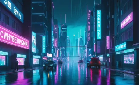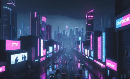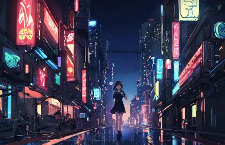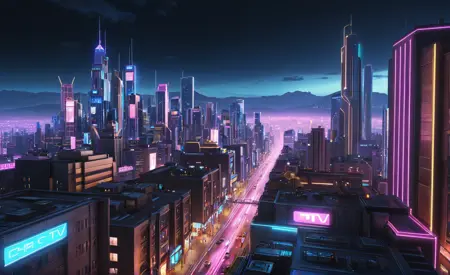 Creates a variant of cyberpunk art, first pass for RokuPunk. (Tags:scenery, outdoors, building, sky, no humans, city, cityscape, cloud, night, tree, road, water, cloudy sky, science fiction, skyscraper, city lights, reflection, bridge, sunset, night sky, street neon lights,realistic, cyberpunk)