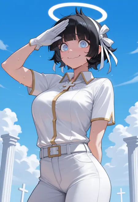 トリガー+外見: az4zel, 短い髪, 黒髪, まっすぐな前髪, 白いヘアバンド, ヘアリボン, 白いリボン, ハロー, 青い目