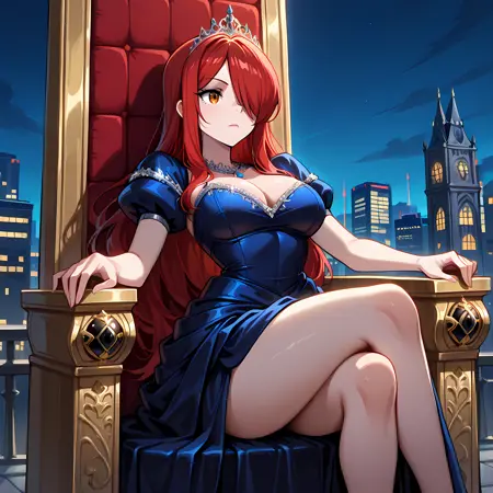 オプション:赤髪、長い髪、片方の目に髪を垂らす、短い黒いドレス、逆さの十字架のネックレス、裸の脚、ハイヒール、閉じた傘、小手銃