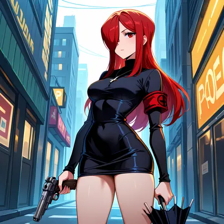 red hair, long hair, hair over one eye, short black dress, inverted cross necklace,bare legs, high heels, closed umbrella, handgun