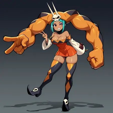 可选:蓝色头发,短发,面部纹身,深色皮肤,深色皮肤女性,短裙,脱落的袖子,裸露肩膀,大腿靴,过膝袜,尖头鞋,格子图案服装,格子图案裤装,帽子,活体衣物,妆容,口红,眼影