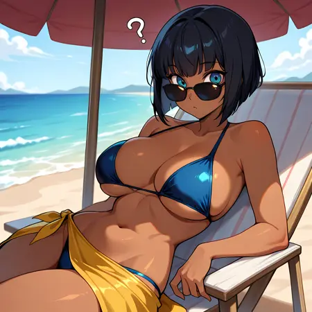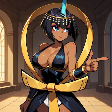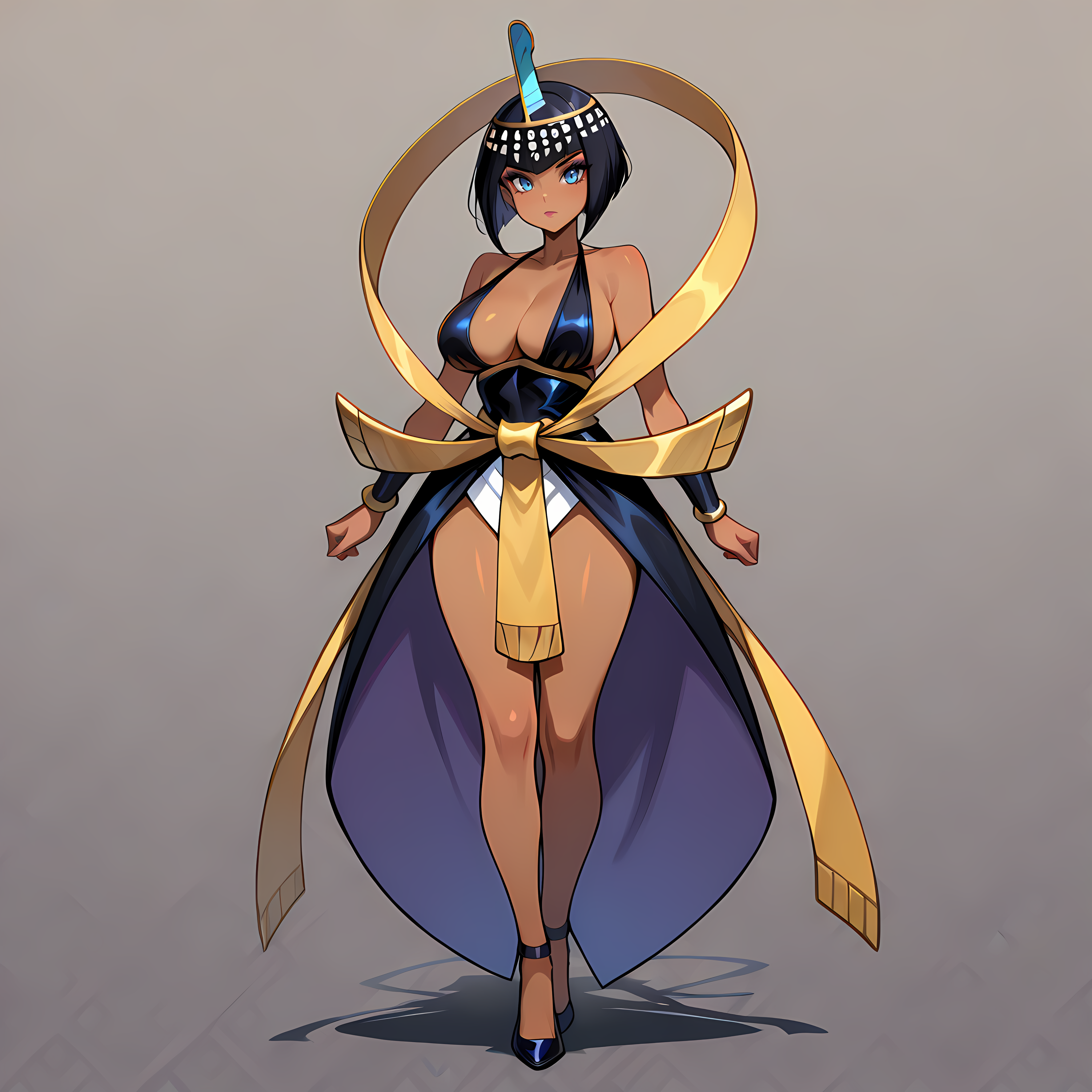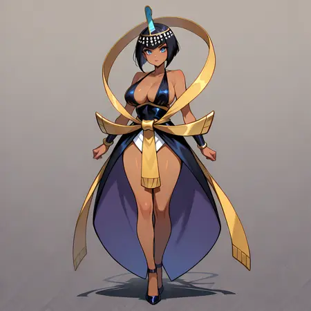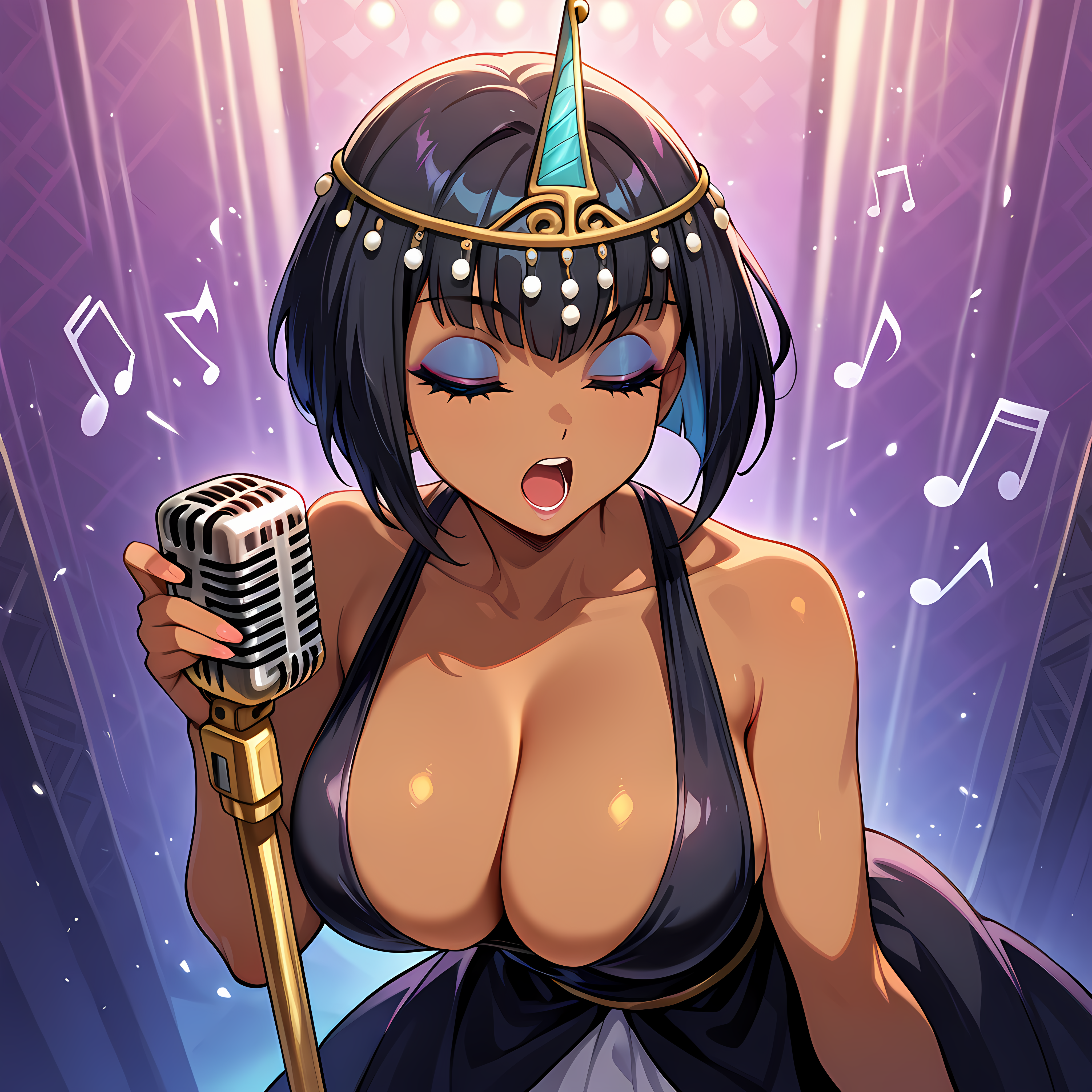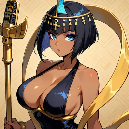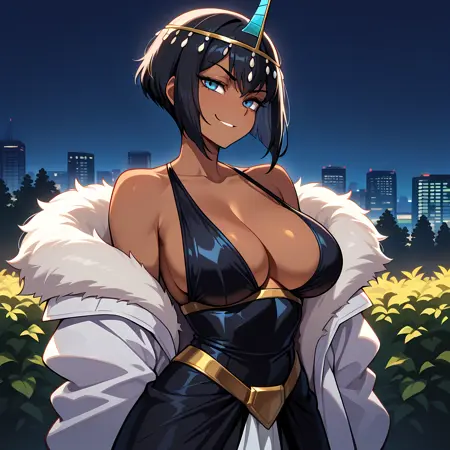 옵션: 검은 피부, 검은 피부를 가진 여자, 단발, 검은 머리, 큰 가슴, 젖가슴, 왕관, 파란 눈, 검은 드레스, 어깨 노출, 홀터넥, 밥컷, 하고로모, 메이크업, 앙크, 사이드보브