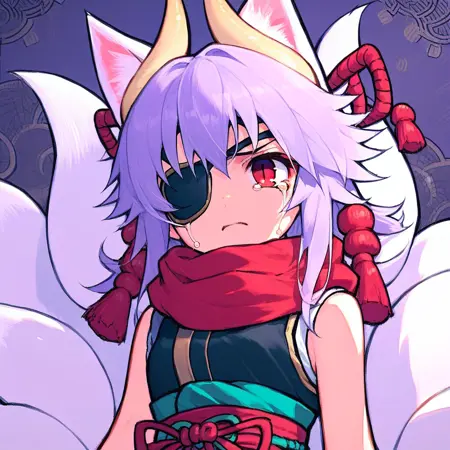 kuon,purple long hair,red eye,fox ear,fox tail,white socks,sleeveless,eyepatch, golden horn, obi, japanese clothes