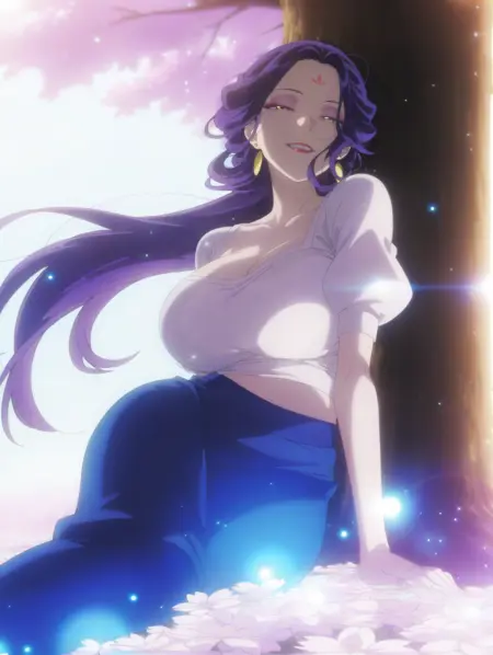tags: madam_il,mature female,purple hair,very long hair,hair ornament,purple hair,yellow eyes,eyeshadow,large breasts,earrings, forehead mark,hanfu,red lipstick,green shawl,sash, dark purple skirt