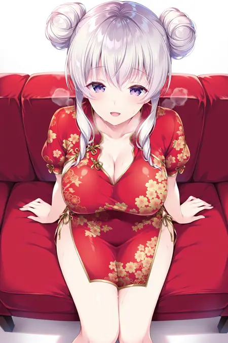 RMai, ChinaMai, 은색_머리, 연보라_머리, 측면 머리카락, 곱슬머리, 더블 뭉치, 보라색 눈, 눈 사이의 머리카락, 중국 복장, 짧은 드레스, 짧은 소매, 볼륨 있는 소매, 빨간 드레스, 플로럴 프린트, 금색 바느질, 허벅지, 옆 트임