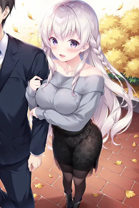 CasualMai, 회색_스웨터, 긴 소매, 손목을 넘어가는 소매, 어깨 드러내기 스웨터, 드러난 어깨, 스트랩리스, 팬티스타킹, 발목 부츠, 하이힐, 검정 부츠, 꽃 목걸이, 허리 높은 스커트, 검정 스커트, 프린트 스커트, 투명 스커트, 플로럴 프린트 스커트, 벨트