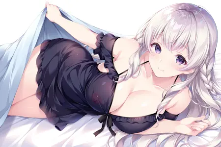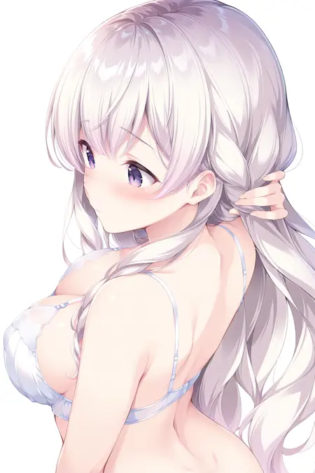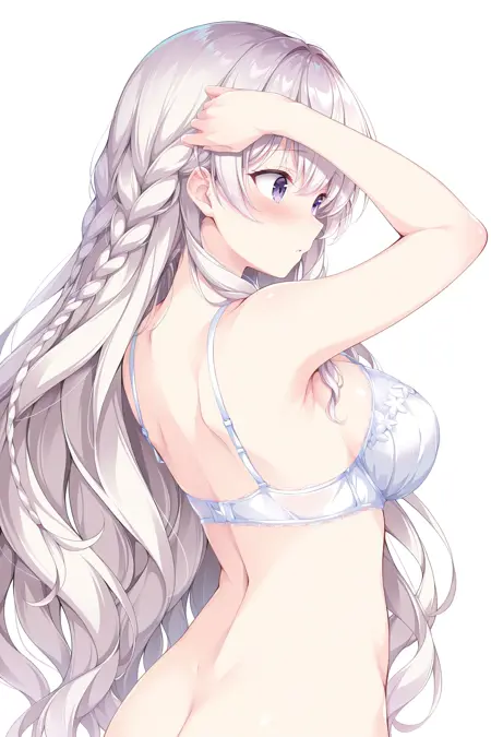 RMai, 은색_머리, 연보라_머리, 긴 머리, 더블 브레이드, 측면 머리카락, 곱슬머리, 보라색 눈, 눈 사이의 머리카락