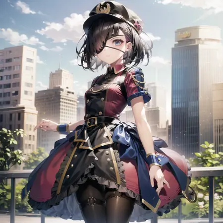 a anime character dressed standing,1girl, eyepatch, pantyhose, black hair, wrist cuffs, boots, solo, hat, dress, black pantyhose, short hair, hair over one eye, outdoors, city background, small breast, flat chest,