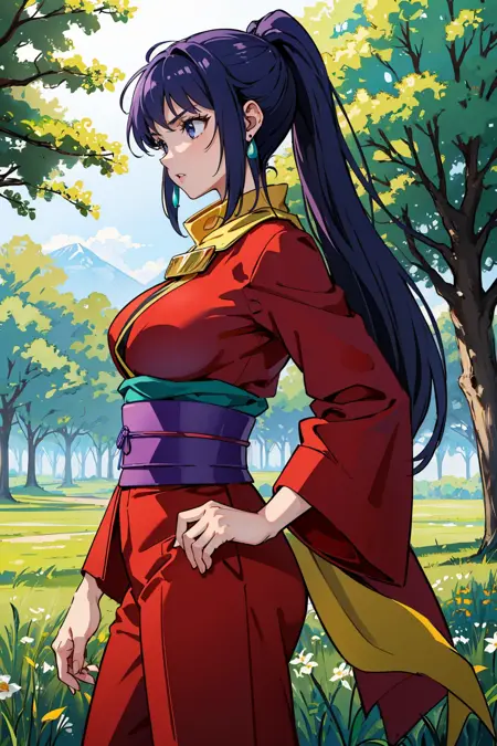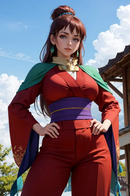 Add "earrings, red kimono, green scarf, red pants" for her typical look.