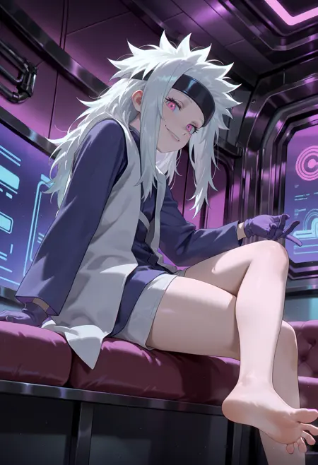 Default outfit: KarenbanaV1, 1girl, white hair, long hair, headband, pink eyes, white vest, vest, purple shirt, long sleeve, long sleeve shirt, gloves, purple gloves, white shorts, purple shin_guards, sandals,