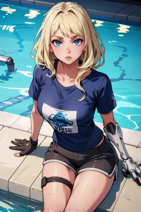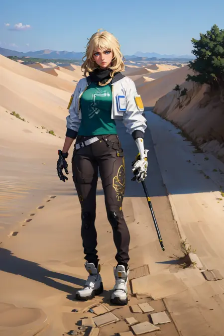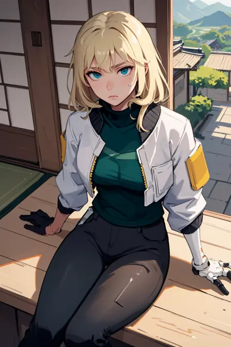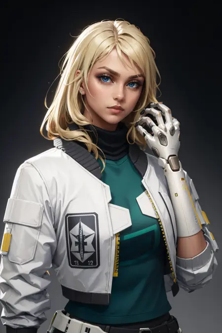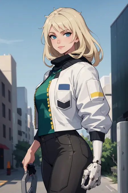Add "white jacket, single mechanical arm, green shirt, black pants, boots" for her typical look. The mechanical arm is somewhat inconsistent.