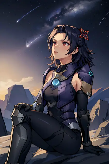 彼女の典型的な外見には、「髪飾り、装甲、ボディスーツ、黒い手袋」を追加してください。