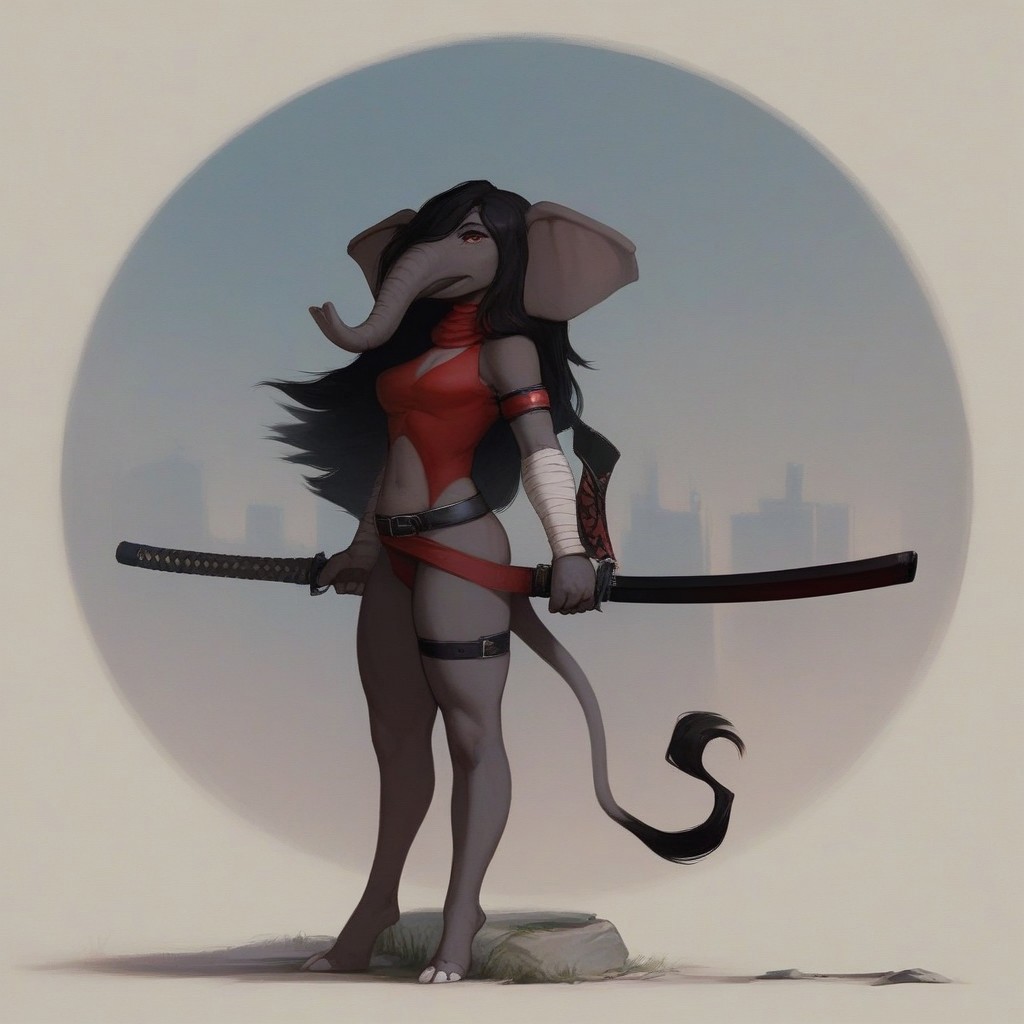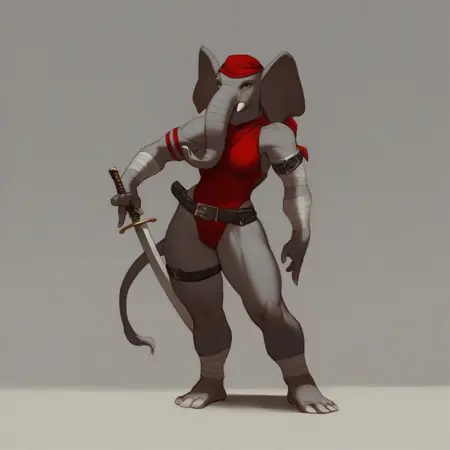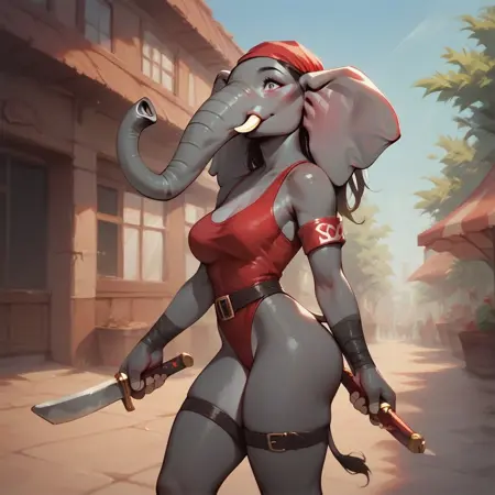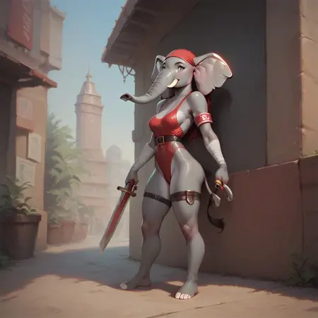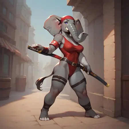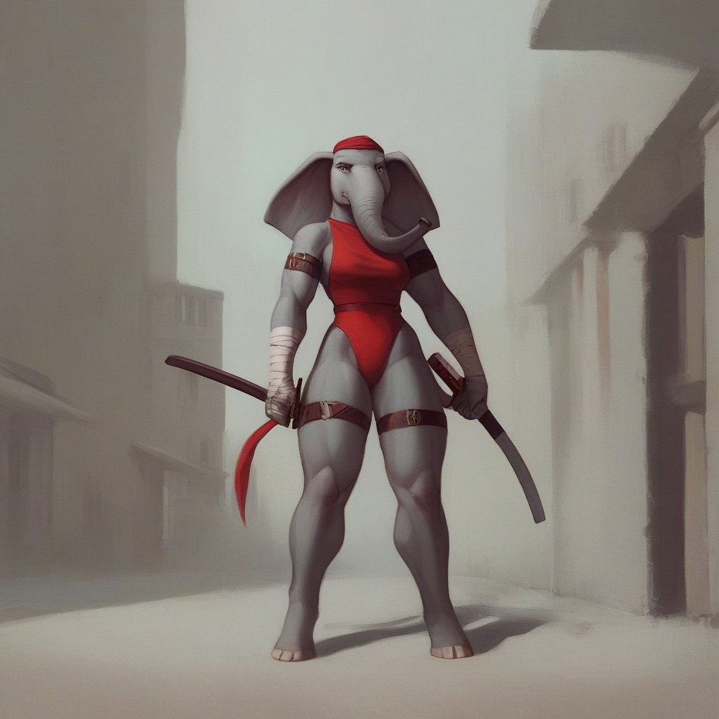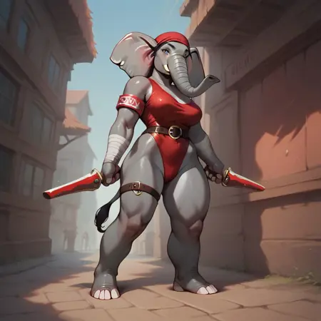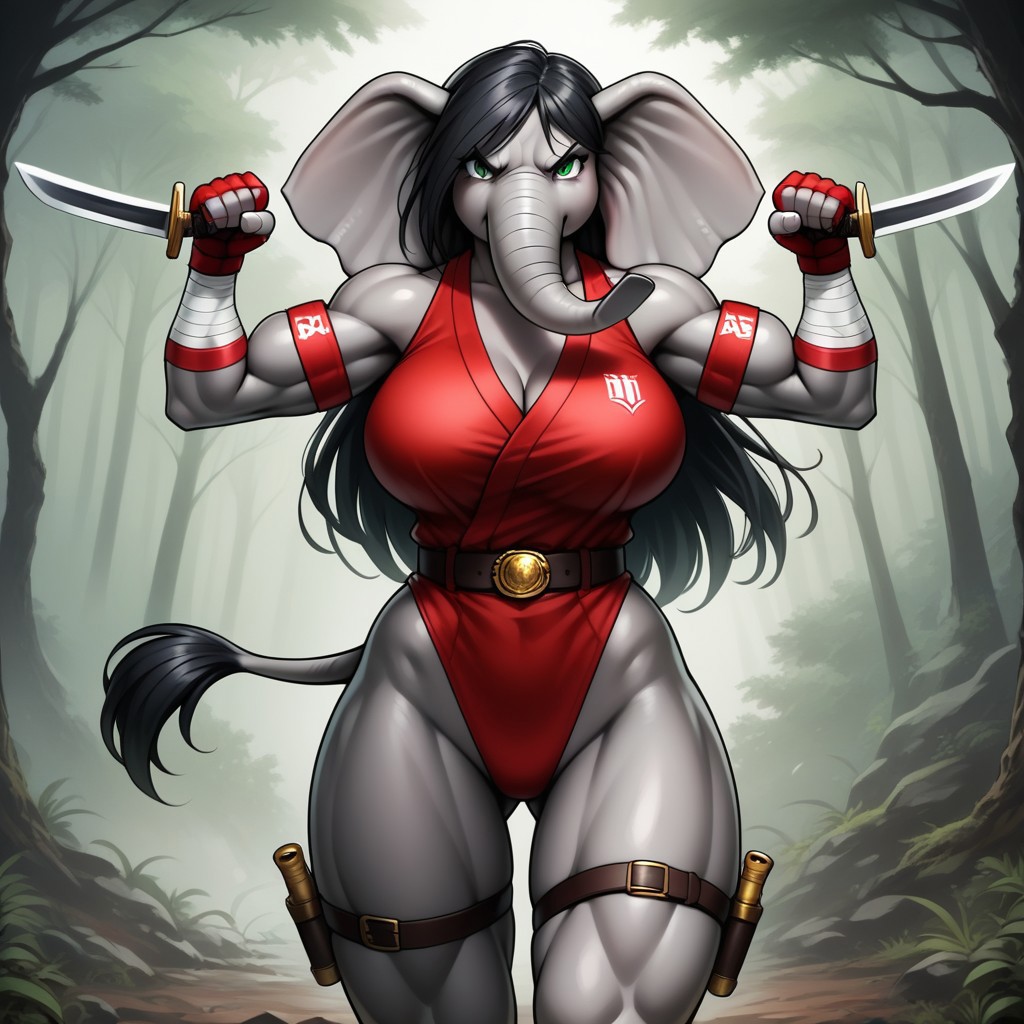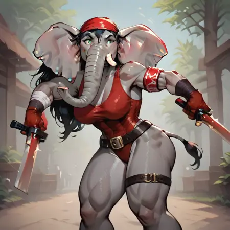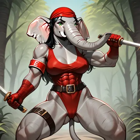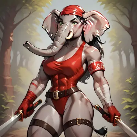 Elektra, female elephant, anthro elephant, white skin, trunk nose, elephant trunk, elephant tail, big muscles, elktra, long hair, bandaged arm, bandana, armband, belt, thigh strap, earrings, halterneck, highleg leotard, dual wielding, holding sword, holding sai (weapon)