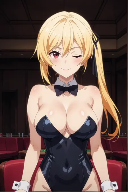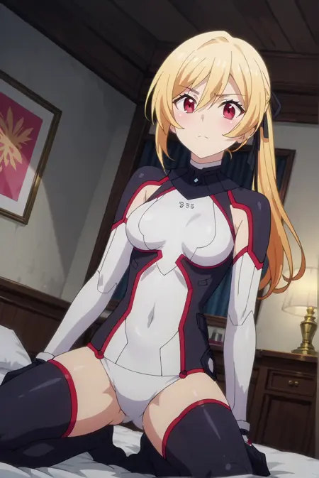 Battle: lises-atis, lises-battle, 1girl, red eyes, blonde hair, black ribbon, hair ribbon, hair between eyes, bangs, side ponytail, bodysuit, battle_bodysuit, gloves, leotard, thighhighs, black thighhighs