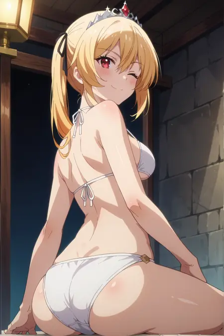 Basic: lises-atis, 1girl, red eyes, blonde hair, black ribbon, hair ribbon, hair between eyes, bangs, side ponytail