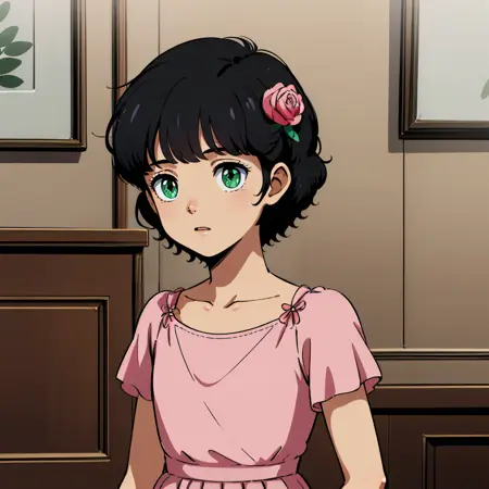 カールヘア、黒髪、ヘアアクセサリー、前髪、緑の目、