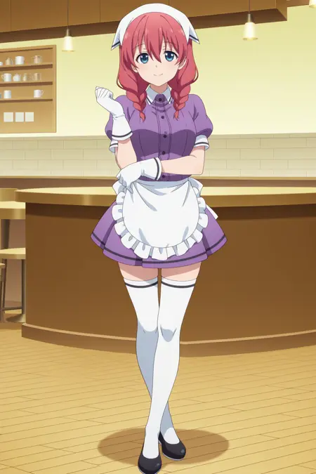 amano miu, 中长发, 粉色头发, 低双辫, 发丝垂于眼间, 蓝色眼睛, 服务员, 头巾, 蓬松短袖, 紫色上衣, 白色手套, 紫色裙子, 白色围裙, 腰部围裙, 花边围裙, 白色背部蝴蝶结, 白色过膝袜, 黑色鞋履, 平底鞋