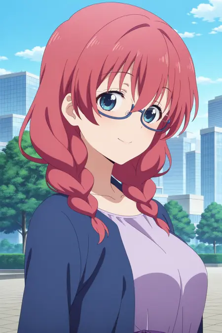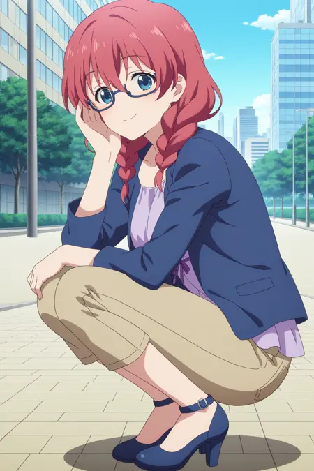 amano miu, 中长发, 粉色头发, 低双辫, 发丝垂于眼间, 蓝色眼睛, 蓝色镜框眼镜, 半框眼镜, 七分袖, 蓝色夹克, 开襟夹克, 紫色衬衫, 紫色丝带, 棕色长裤, 七分裤, 蓝色鞋履, 绑带高跟鞋