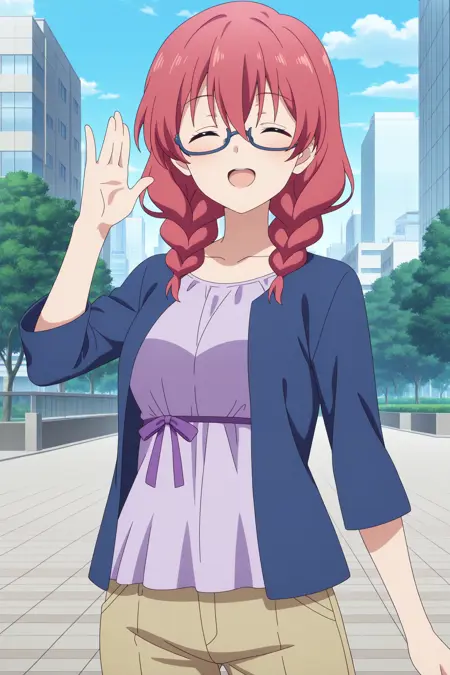 amano miu, medium hair, pink hair, low twin braids, hair between eyes, blue eyes, blue-framed eyewear, semi-rimless eyewear, three-quarter sleeves, blue jacket, open jacket, purple shirt, purple ribbon, brown pants, capri pants, blue footwear, strappy heels