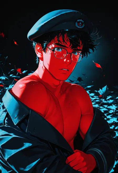 "Color": "red" and "blue" dramatic light, "yellow" and "green" color scheme,