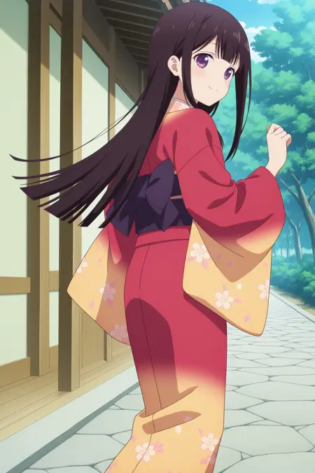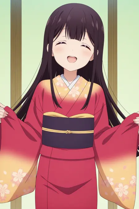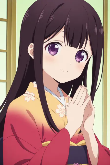 sakuranimiya aika, long hiar, black hair, double-parted bangs, sidelocks, purple eyes, Japanese clothing, long sleeves, wide sleeves, red kimono, gradient kimono, obi, obiage, obijime, white socks, tabi, zouri