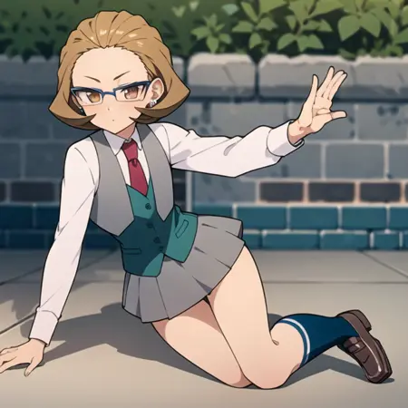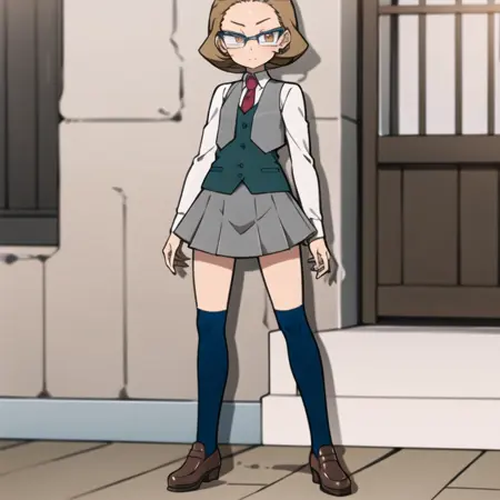 기본 복장: 학교 유니폼, 넥타이, 양말, 조끼, 무릎높이 양말, 회색 치마, 주름치마, 신발