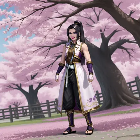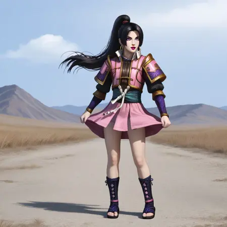 일반적으로 - 1boy, solo, 파니테일, 긴 머리, 검은 머리, 보라색 눈, 메이크업, 립스틱, 귀걸이, 갑옷, 바지, 부츠