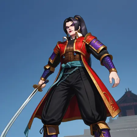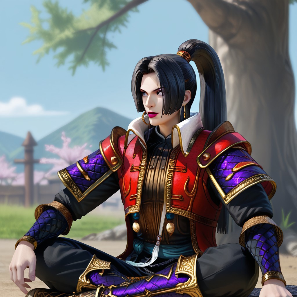 一般而言 - 1个男孩,单人,马尾辫,长发,黑发,紫眼睛,妆容,口红,耳环,盔甲,裤子,靴子