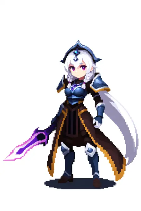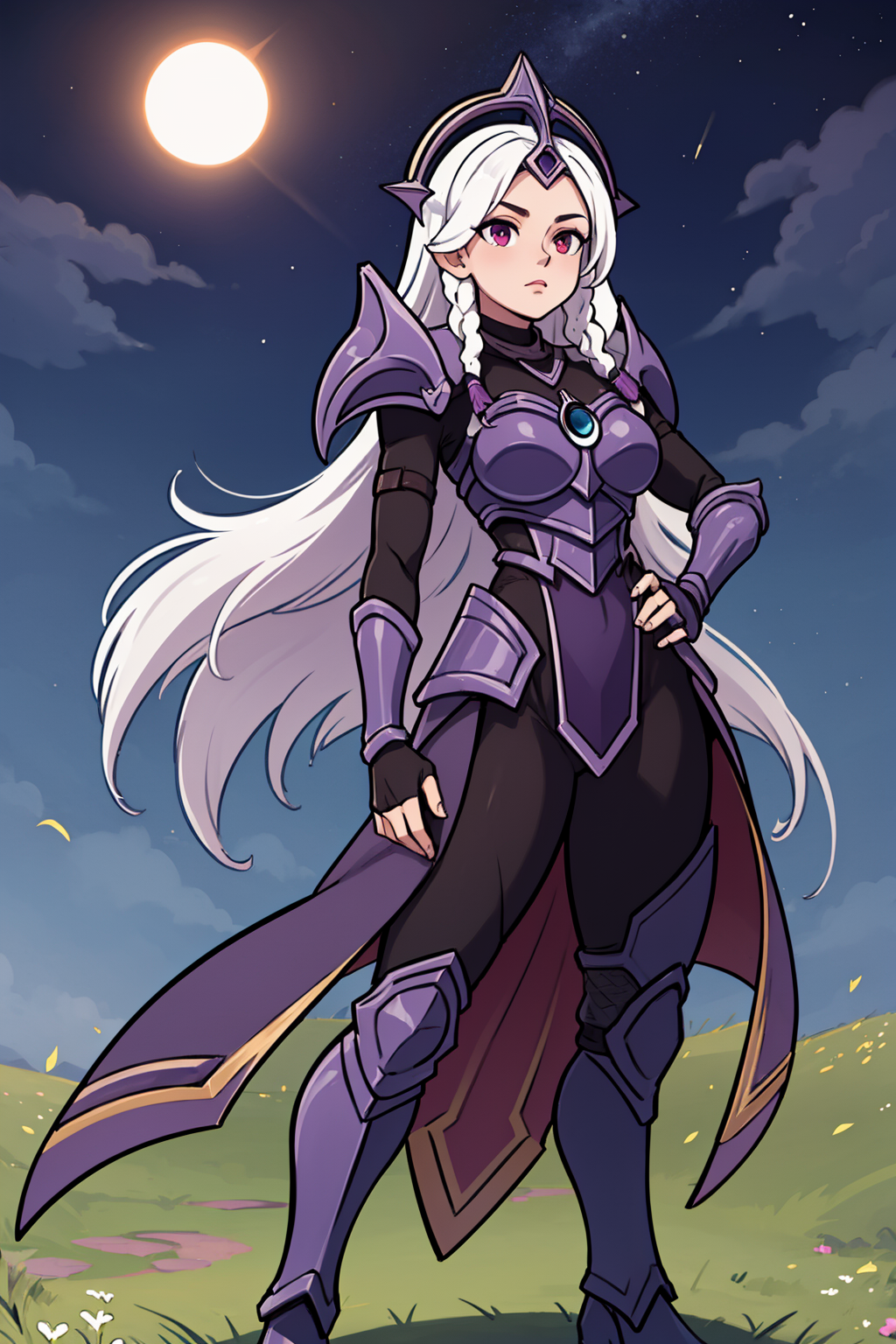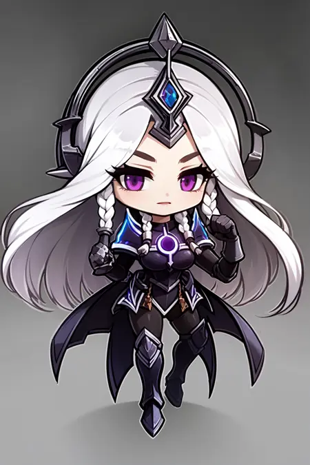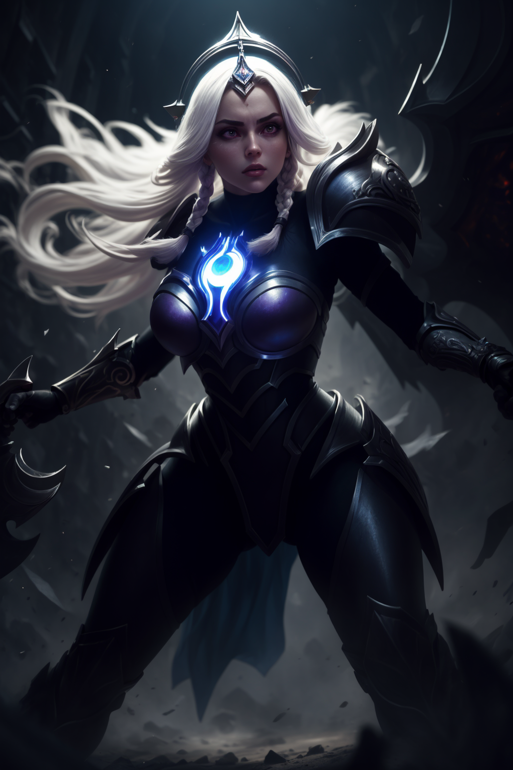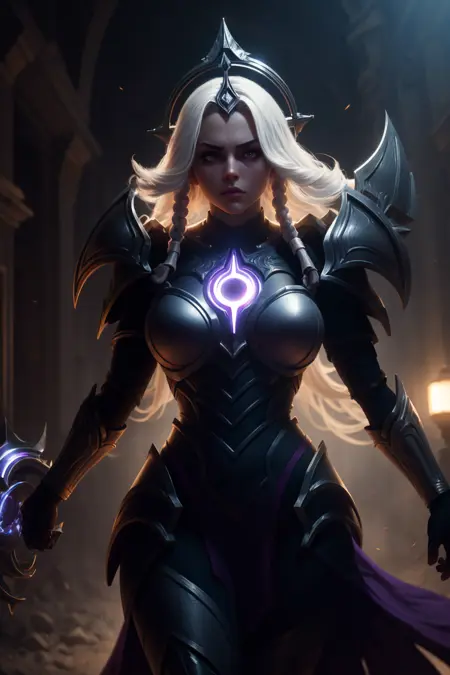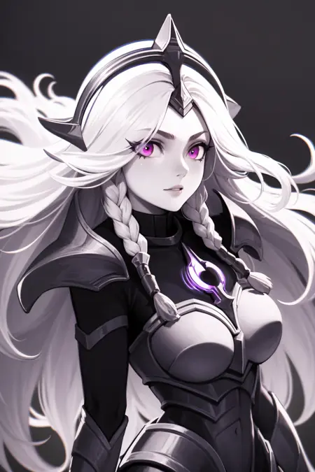 提示词激活器:leona其他提示词:白发,长发,双马尾,紫色眼睛,肩甲,盔甲
