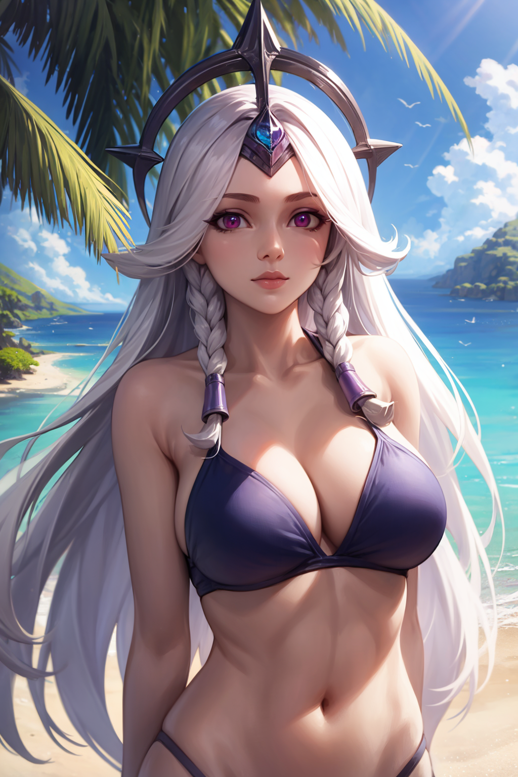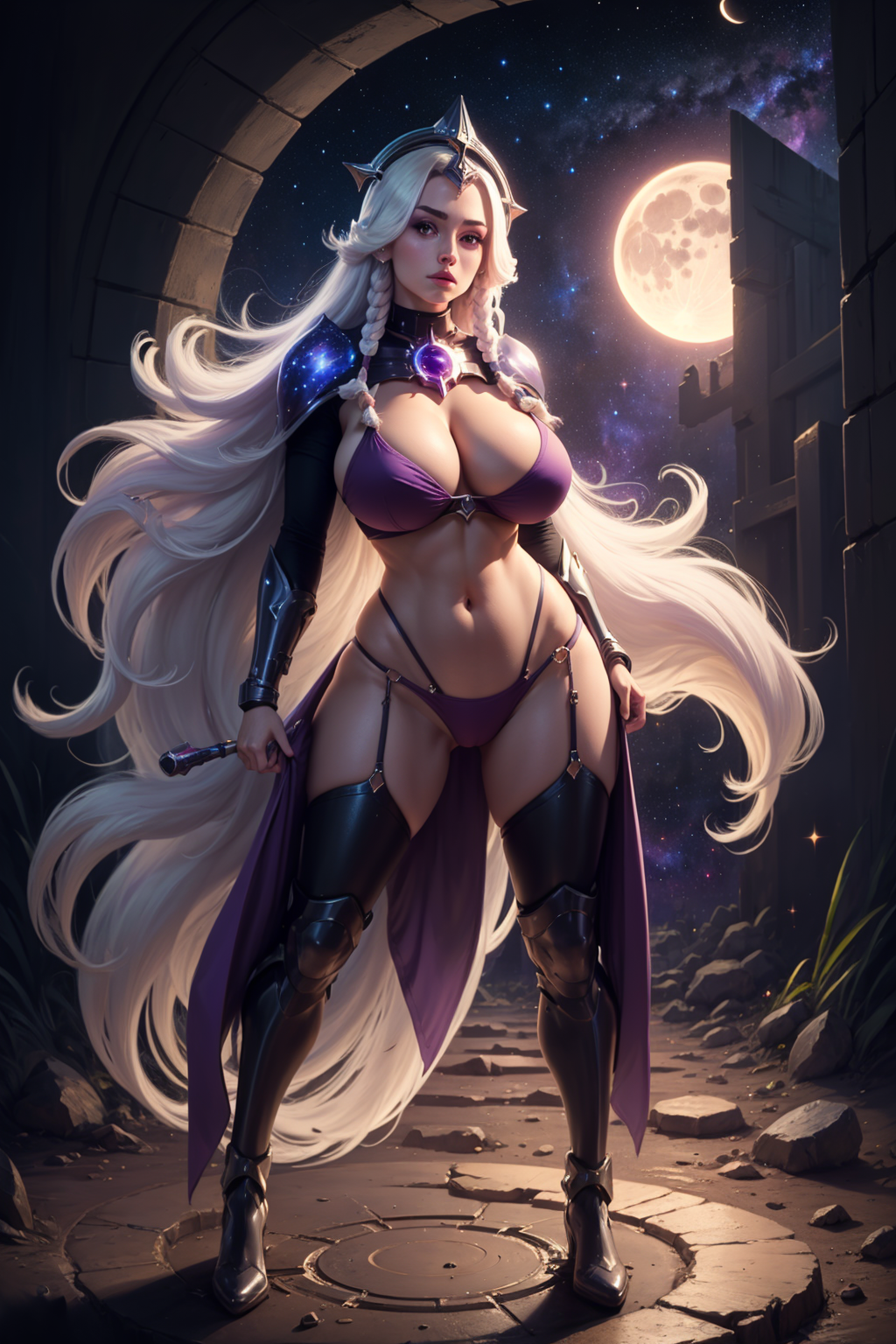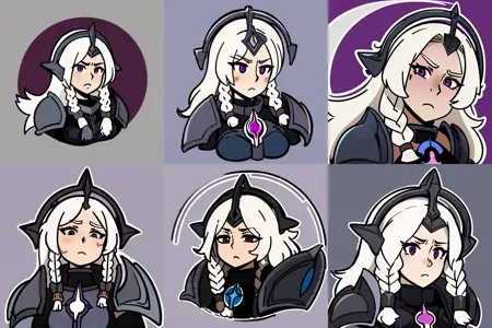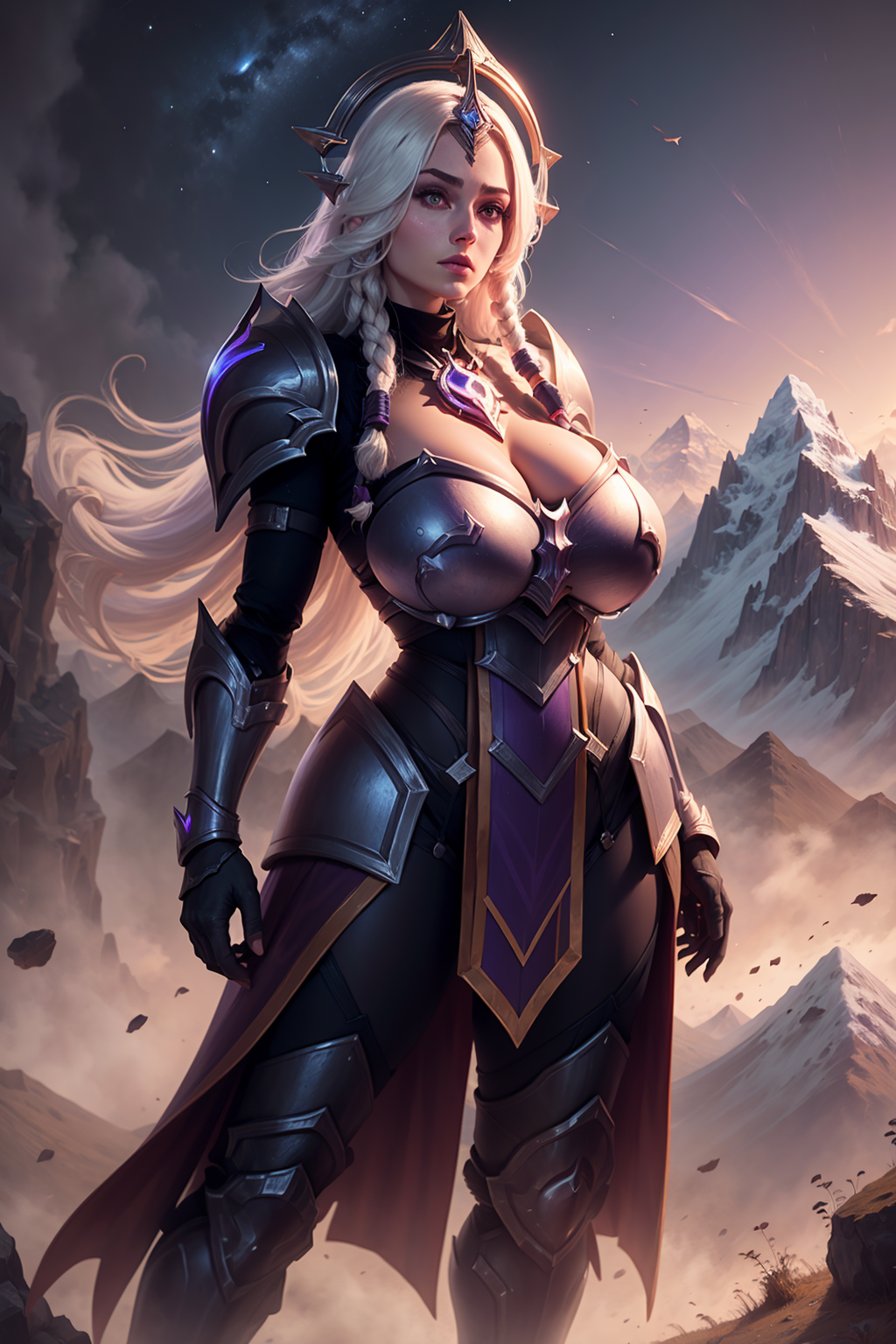 提示词激活器:leona其他提示词:白发,长发,双马尾,紫色眼睛,肩甲,盔甲