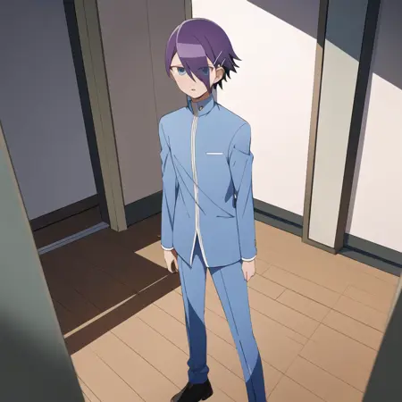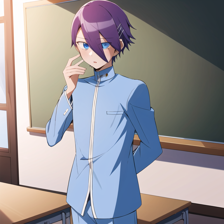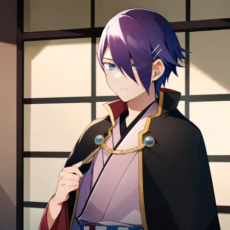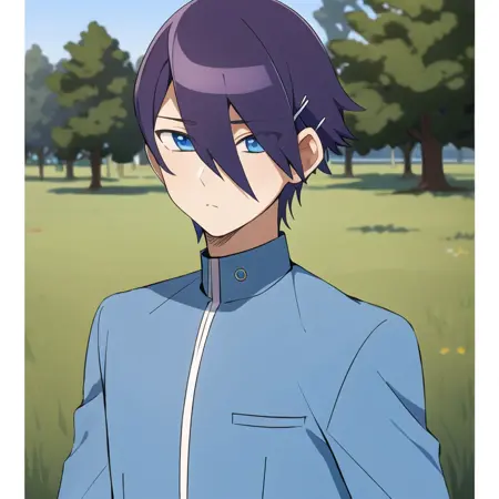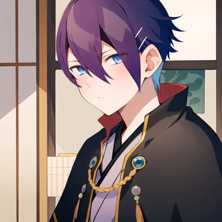 머리카락/특징: 파란 눈, 보라색 헤어, 단발, 눈 사이의 머리카락, 머리카락 사이로 보이는 눈, 헤어클립, 헤어 장식