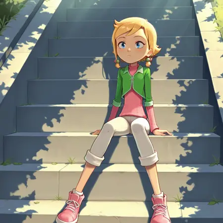 cathy_mbc, 1girl, blonde_hair, short hair, hair bobbles, blue eyes, sweater, vest jacket, pants