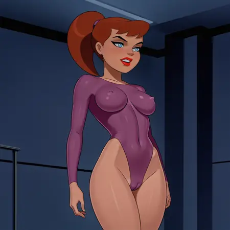 Trigger with gymnastic clothes but slightly erotic: BarbaraGymnastics, 1girl, medium breasts, purple leotard, covered nipples, blue eyes, brown hair, cameltoe, makeup, ponytail, lipstick, covered navel, highleg leotard, impossible clothes, red lips