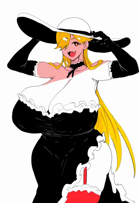 Main costume: sun hat, black dress, frills, strapless dress, black elbow gloves, bare shoulders, choker, detached collar