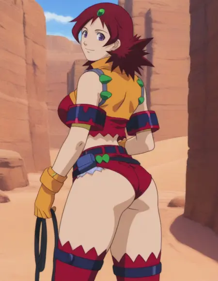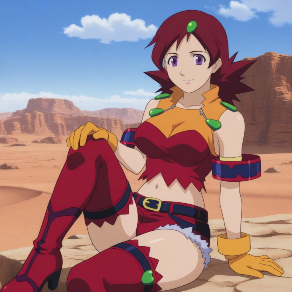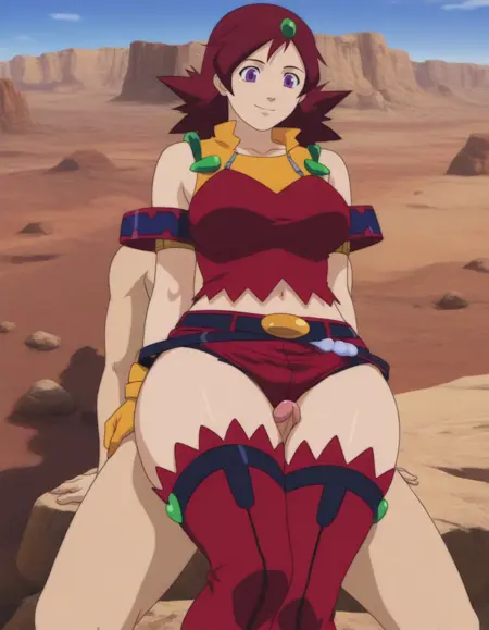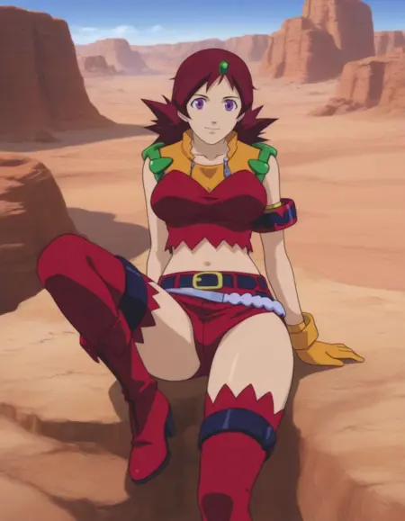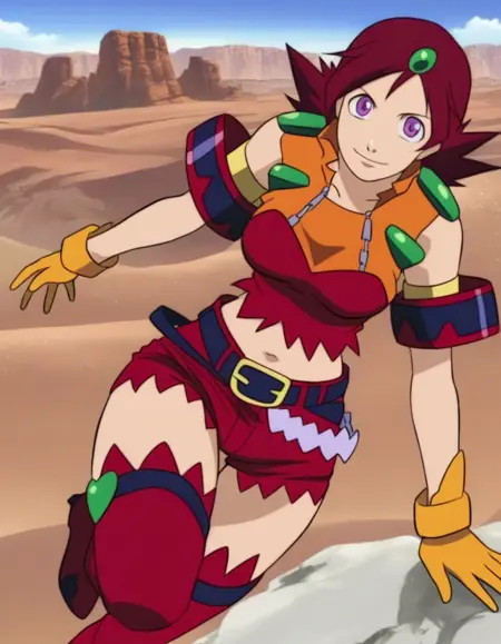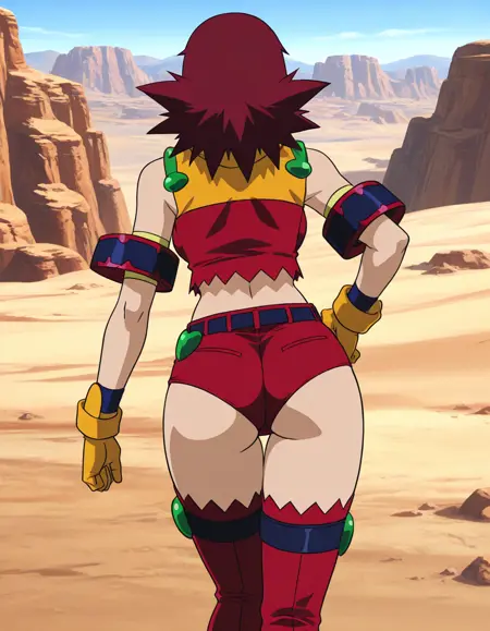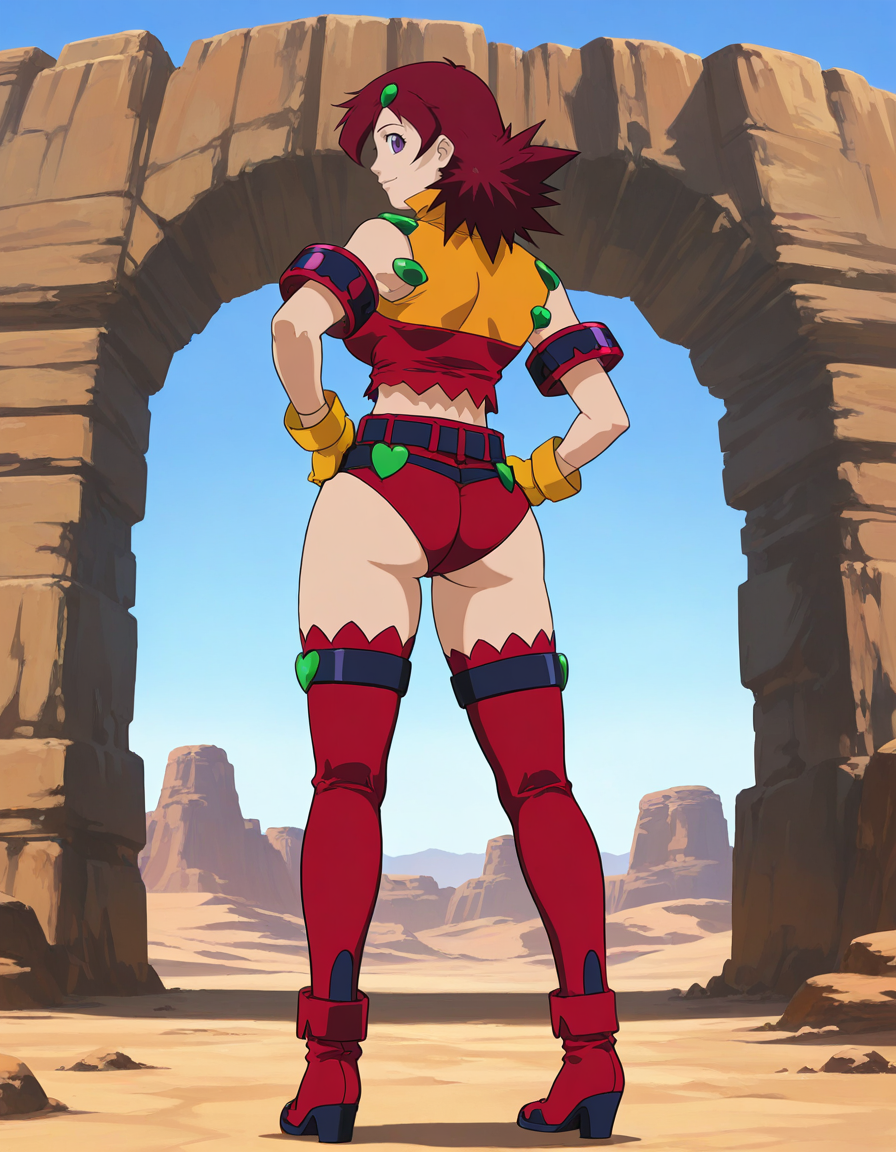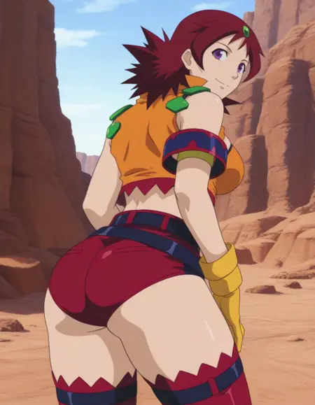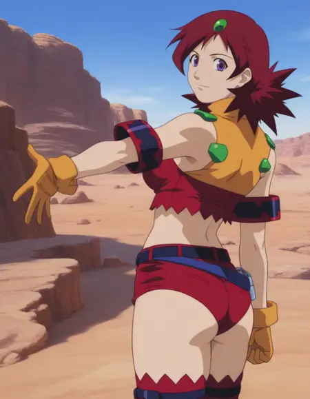 Naomi Fluegel, red hair, spiky hair, purple eyes, yellow gloves, red thighhighs, red short shorts, thighs, green hair ornament, arm bands, exposed shoulders, red high heeled boots, midriff, navel, zettai ryouiki