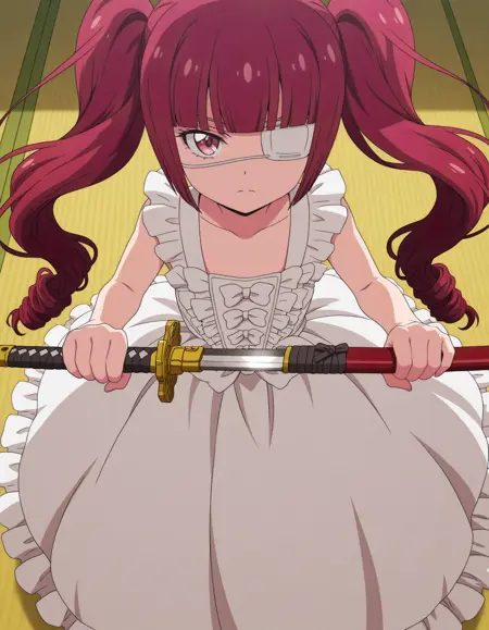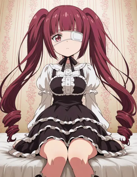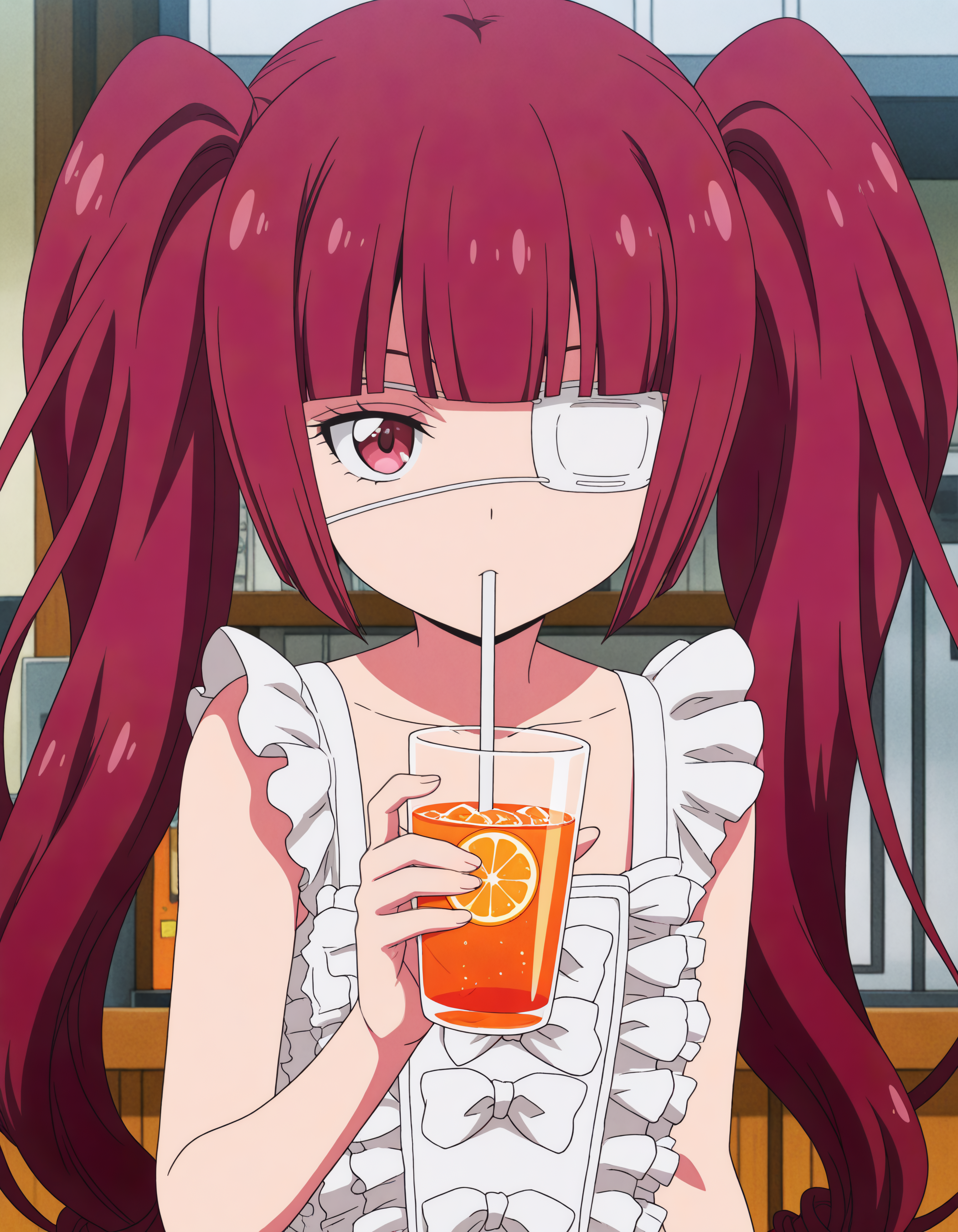 트리거: pirunu, 빨간 눈, yurii, 진한 빨간 머리, 눈 보호대, 더블 테일, 의료용 눈 보호대