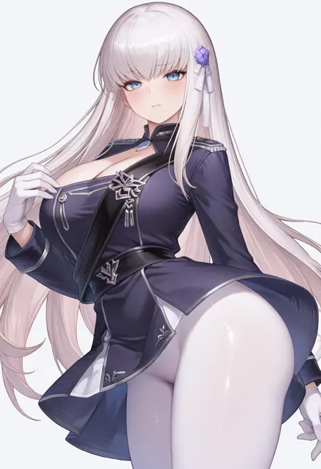 BD2Bureido-YL,巨乳,巨乳,蓝眼,长发,白发,发饰,紫色军装,肩章,乳沟,胸针,腰带,白色手套,白色连裤袜,黑色高跟鞋,