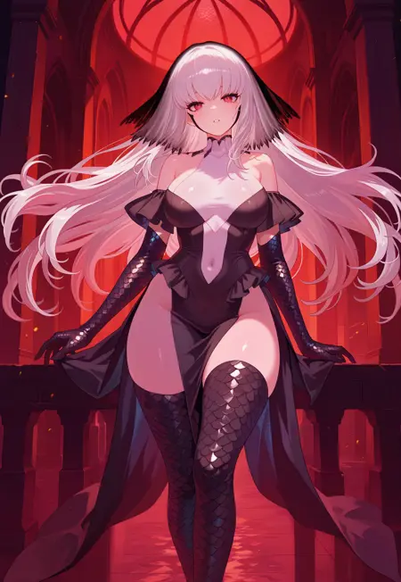 BD2Bureido-AP,巨乳,红眼,长发,白发,黑色面纱,白色上衣,黑色分体袖,黑色连衣裙,遮盖肚脐,黑色龙鳞肘套,黑色龙鳞过膝袜,黑色鞋履,高跟鞋,