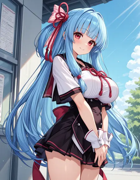 Ubutsuchi_Uniform, school uniform, pink ribbon, wrist cuffs, short sleeves, black skirt