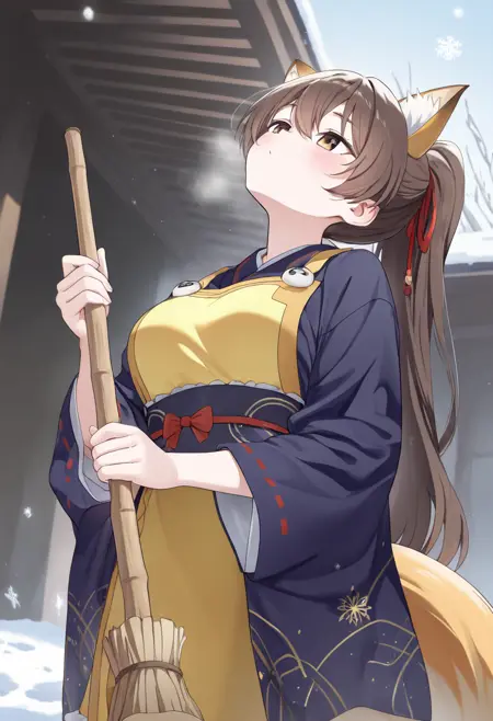棕色眼睛、动物耳朵、长发、马尾、棕色头发、发饰、狐狸耳朵、狐狸尾巴