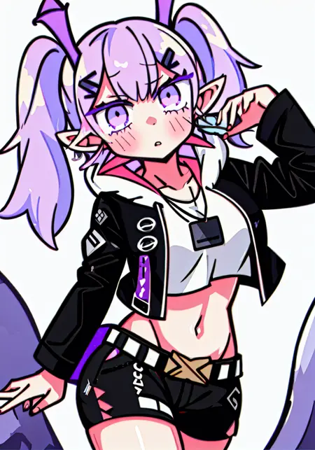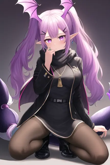 - The pruned character tags are head wings, long hair, wings, purple hair, pointy ears, purple eyes, hair ornament, tail, twintails, breasts, hairclip, pink eyes, large breasts. You can add them into prompts when core features (e.g. hair color) of character is not so stable.
