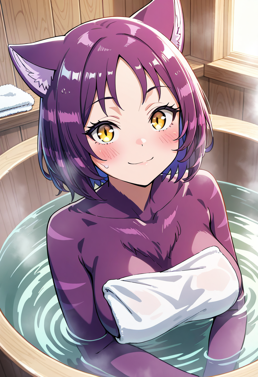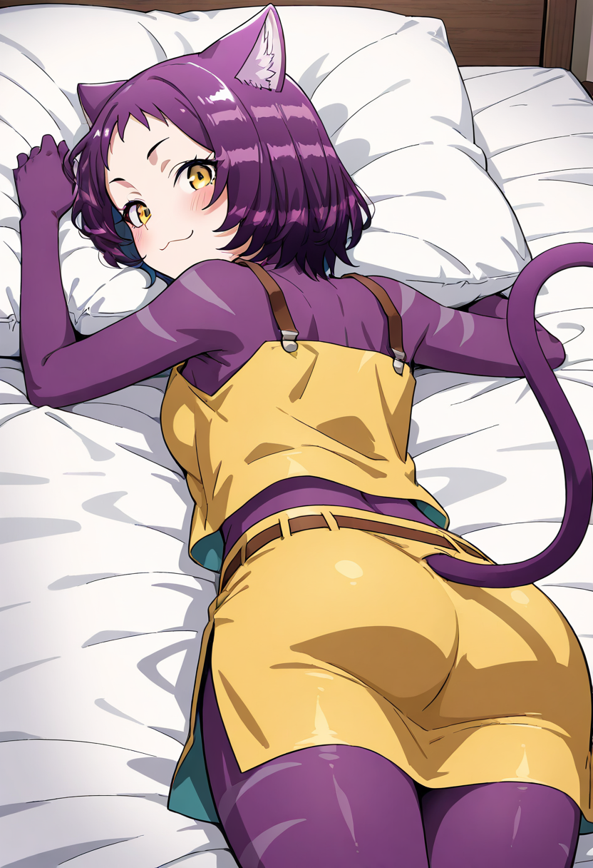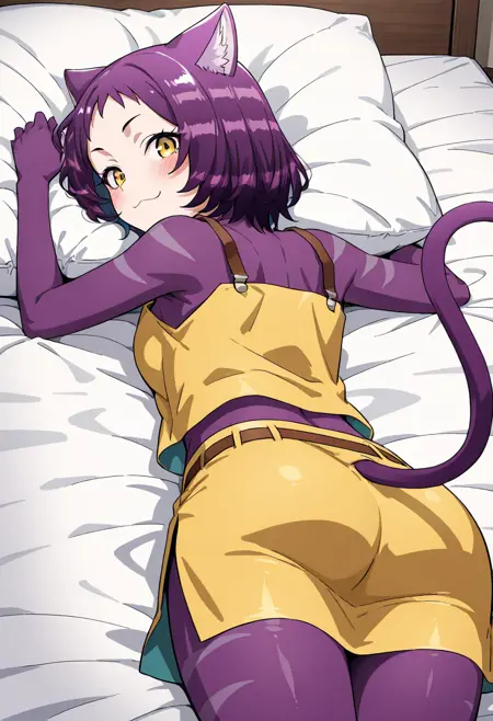 玛蕾 - zzMyarey, 1girl, solo, furry female, yellow eyes, short hair, cat ears, skirt, purple fur, purple hair, boots, midriff, belt, cat tail, brown footwear, knee boots, cross-laced footwear, lace-up boots,
