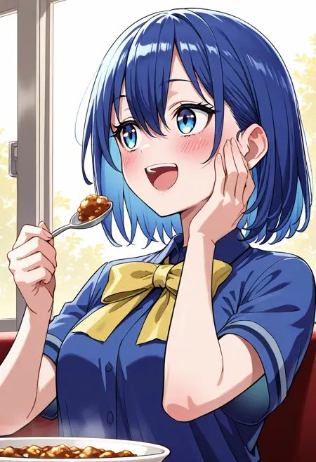 银莲花 - zzAnemone, 1girl, solo, short hair, bangs, blue eyes, blue hair, short sleeves, blue dress, yellow bowtie,