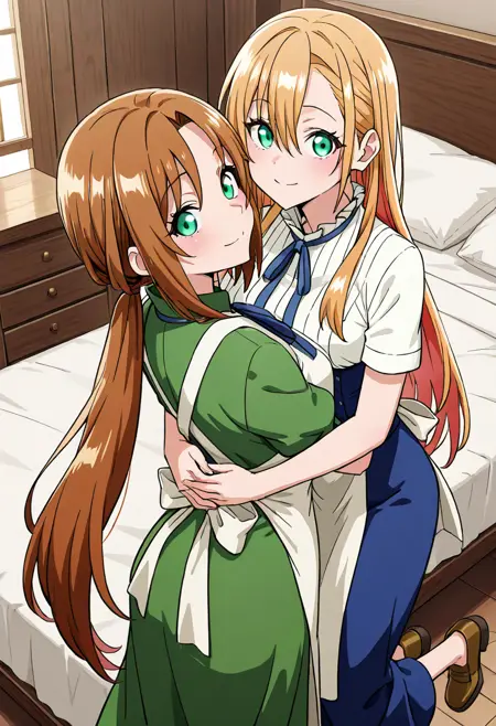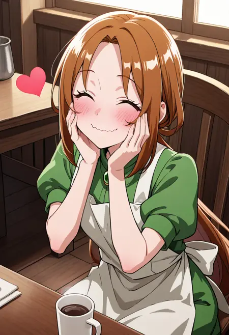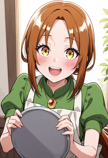 杜鹃 - zzAzalea, 1girl, solo, long hair, brown hair, ponytail, green dress, short sleeves, apron,