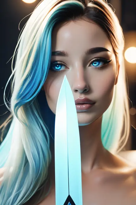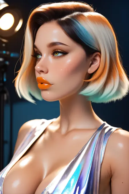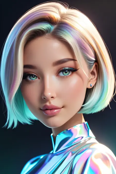 她的目光如远方星系倒映于静水,双眼似穿透维度,揭示灵魂深处隐藏的星座。发丝由液态蛋白石编织,流淌着虹彩光带,在无形阳光下由蔚蓝渐变为极光粉红。肌肤明亮,并非仅反射光线,而是仿佛自内生成——一种源自体内的辉光,如同超新星的余韵流淌于血脉。无论伫立于霓虹灯照耀的城市景观中,或沐浴于远方星辉之下,Iridescia Prismara 都是赛博幻想与诗意超越的交汇点,是为激发惊叹、震撼并突破数字领域极限而生的缪斯。
