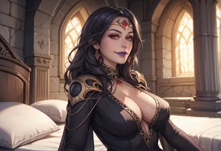 Sophiax, black hair, circlet, jewelry, red eyes, purple lips, large breasts, cleavage, black dress, dark dress, deep plunge, pelvic curtain, side slit,