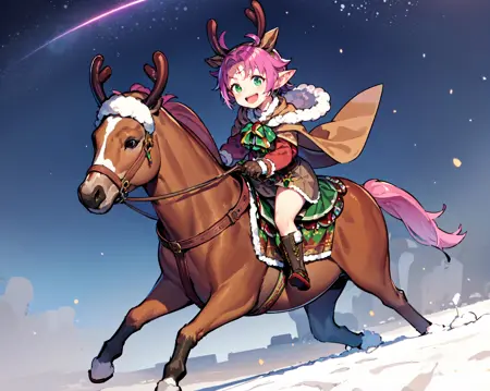 【겨울 옷차림 프롬프트】: win_fae, 벌어진 입, 망토, 털 장식, 부츠, 긴 소매, 드레스, 사슴 뿔, 장갑, 갈색 장갑, 종, 활