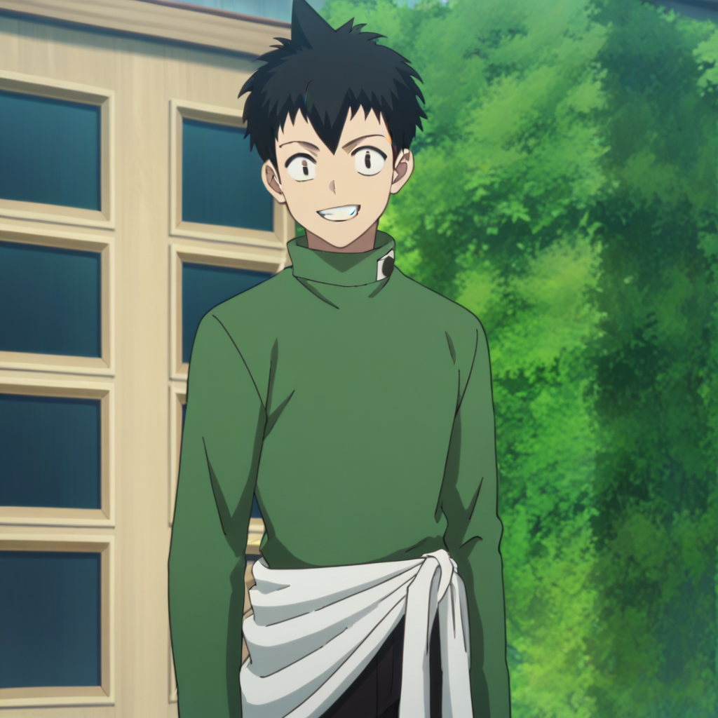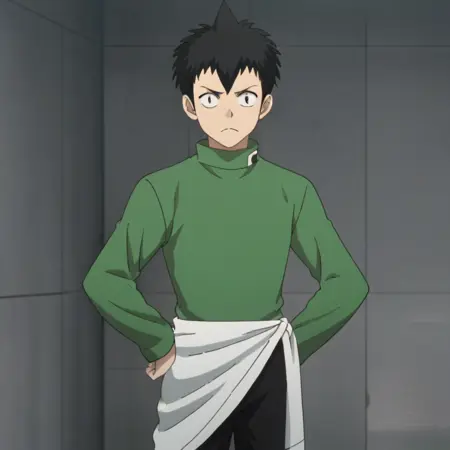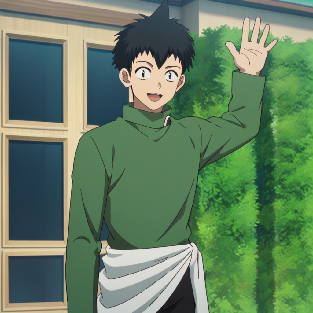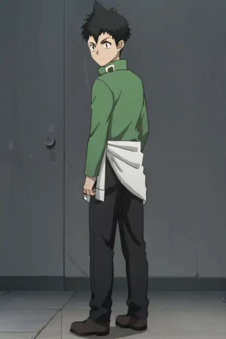 提示:男性,黑发,尖刺发型,黑眼睛,绿色长袖衬衫,腰部系白色衬衫,黑色裤子,棕色便鞋,室内(电脑室/瓷砖/玻璃/门),室内(楼梯间),室外(城市/建筑/窗户/灌木)