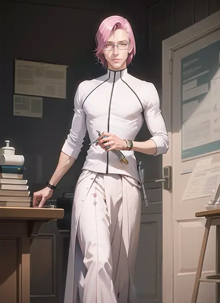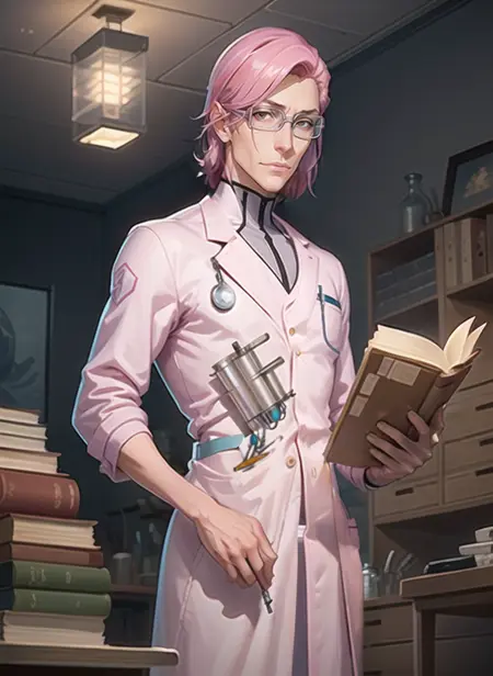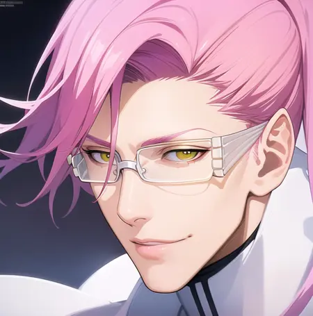 best quality, masterpiece, original art, full body, 1man, solo, (adult:1.4), (slim), ((skinny)), (((slender))), tall, sexy, handsome, attractive, (white kilt:1.4), (white turtleneck), (white leggings), (white clothes), (((adult face))), (((manly face))), ((long face)), (((Keanu Reeves haircut))), hair over one eye, (((pink-haired))), (((smiling))), (((yellow eyes))), (((white glasses))), handsome symmetrical face, posing sexy, perfect face, 8k
