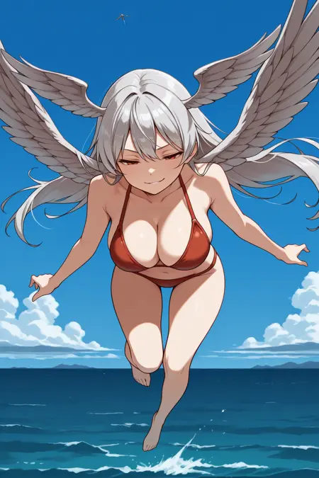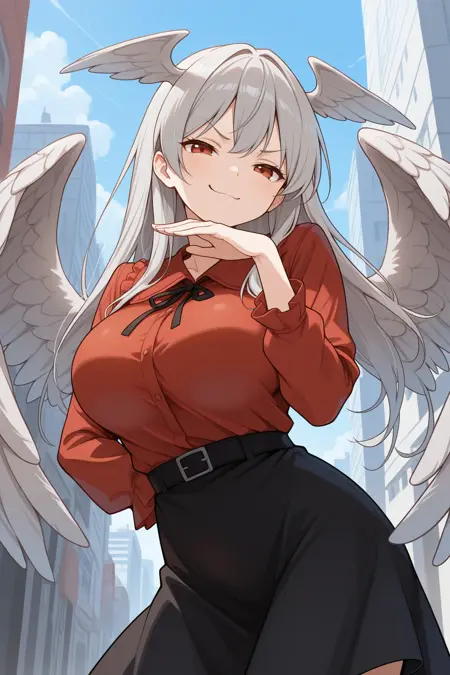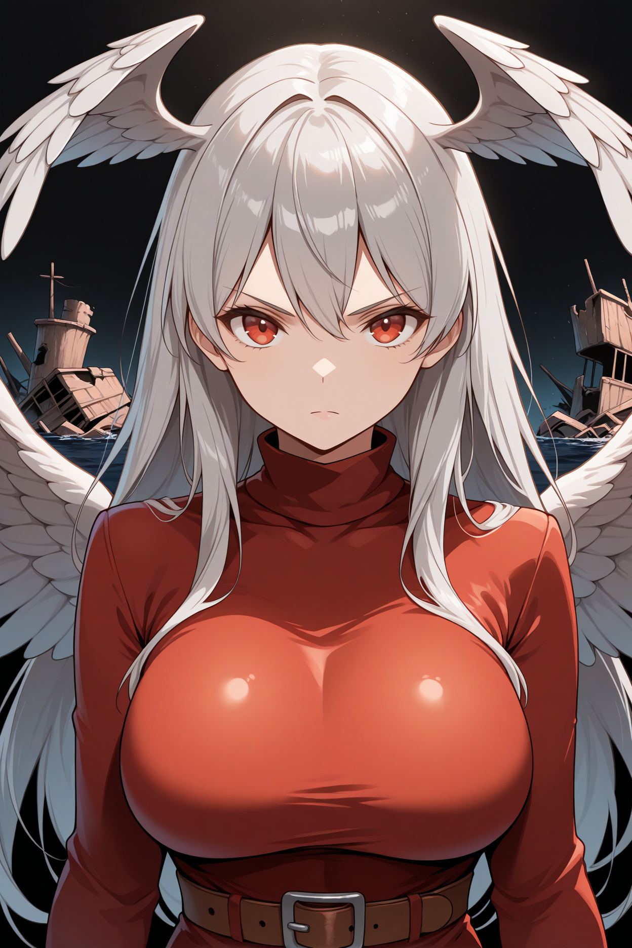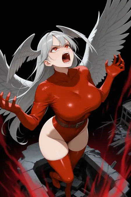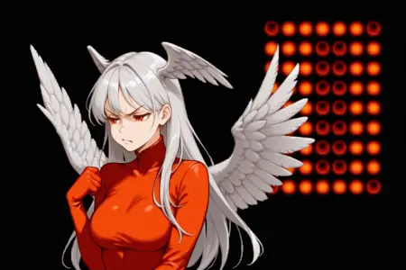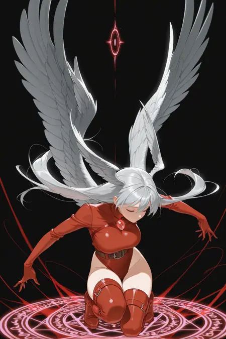 触发词为 "fftult",且必须包含 "head wings, silver hair, long hair, red eyes, feathered wings"。